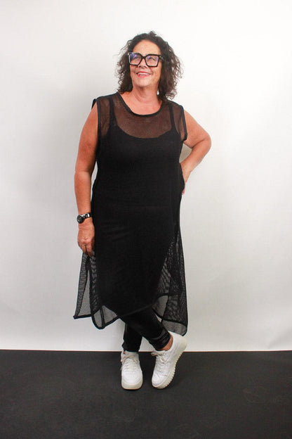 Introducing the TCD Xena Tunic, the latest addition to our layering collection. This unique textual piece acts as a protective armor, featuring an asymmetrical hemline and dual side slits. Finished with a binding, it boasts a sheer design and sleeveless style. Check out the video to see how it moves on the body.